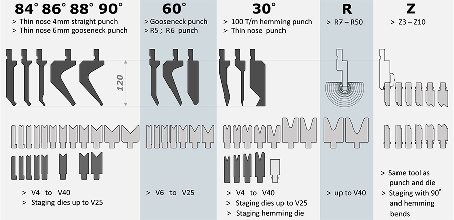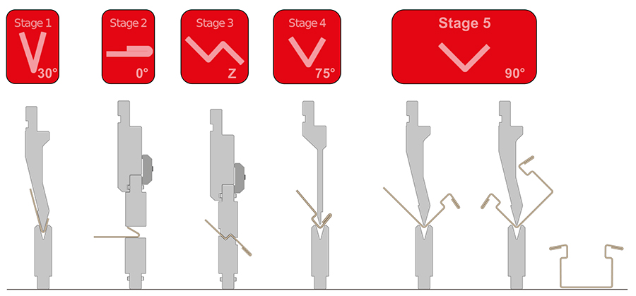 Wiele profili stempli i matryc ma wspólny skok, co umożliwia wykonywanie na jednej prasie krawędziowej etapów pod kątem 90°, etapów pod ostrym kątem, etapów zawijania i etapów offsetowych.