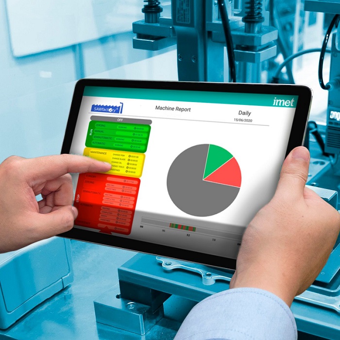 | PRZEMYSŁ 4.0 READY - SAWfactory Dzięki systemowi SAWFACTORY, automatyczne piły taśmowe Imet integrują się z Przemysłem 4.0, umożliwiając zdalne zarządzanie i wsparcie. Oprogramowanie umożliwia programowanie cięcia z poziomu komputera PC oraz przesyłanie danych przez USB. Za pomocą dedykowanej aplikacji można monitorować cały proces produkcji w czasie rzeczywistym. |