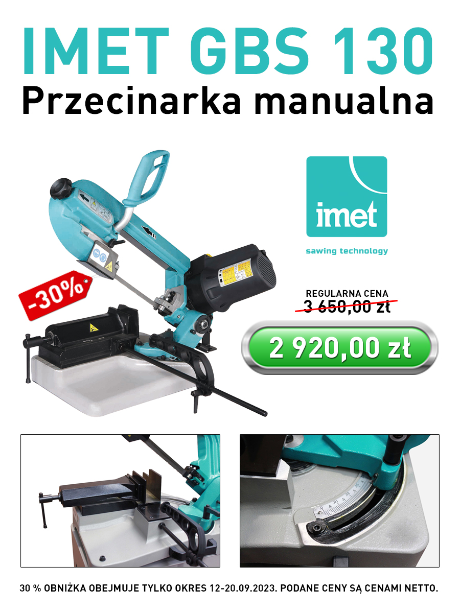 Z okazji rozesłania 100-go newslettera do naszych klientów, mamy szczególną propozycję cenową na model GBS 130 włoskiej firmy IMET. Przecinarka taśmowa od 3 do 10 października 2023 będzie dostępna aż z 30 procentową bonifikatą!!!